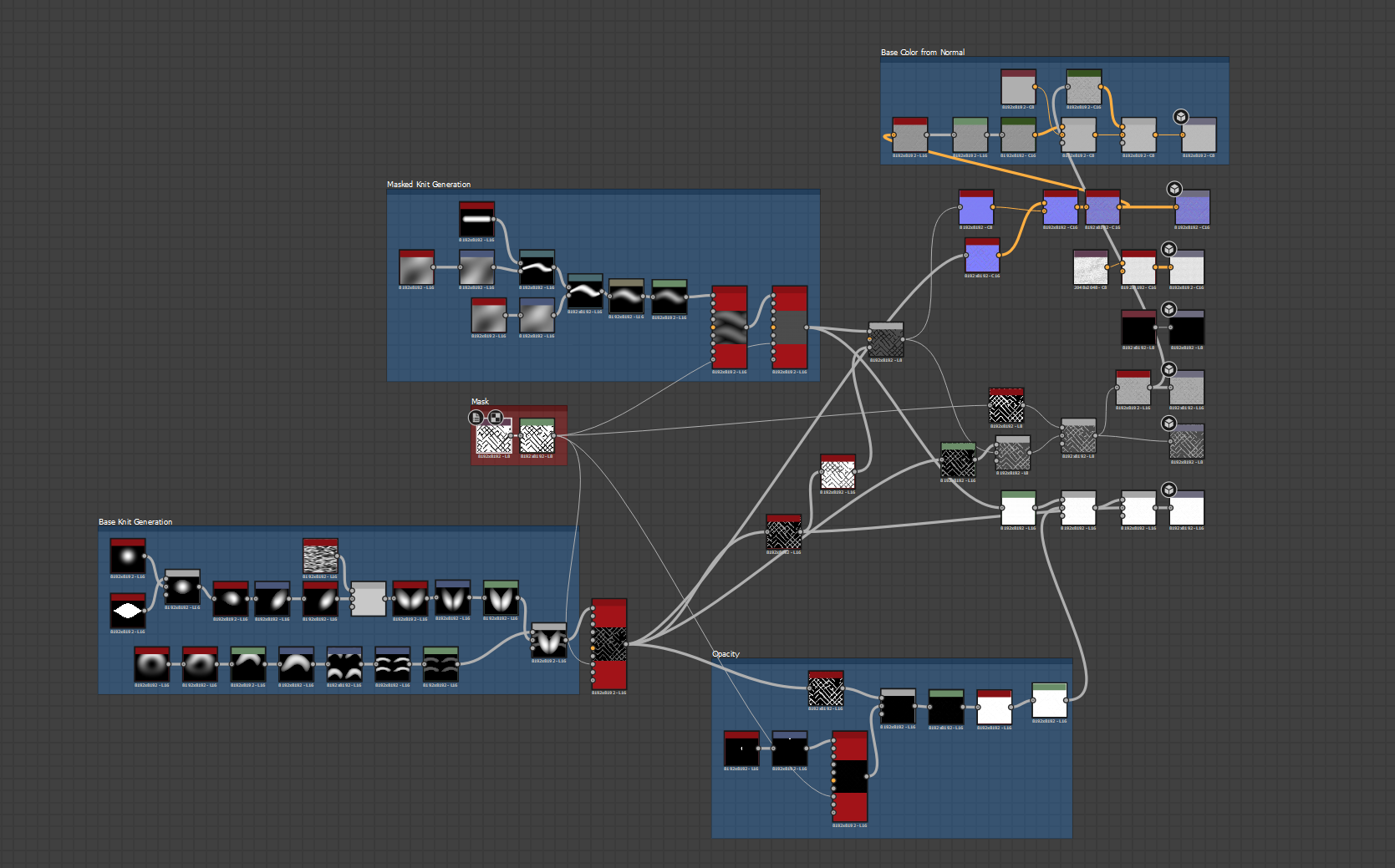 The two knit structures are developed procedurally, and the schematic below is used as the mask input to a tile sampler to properly align them.